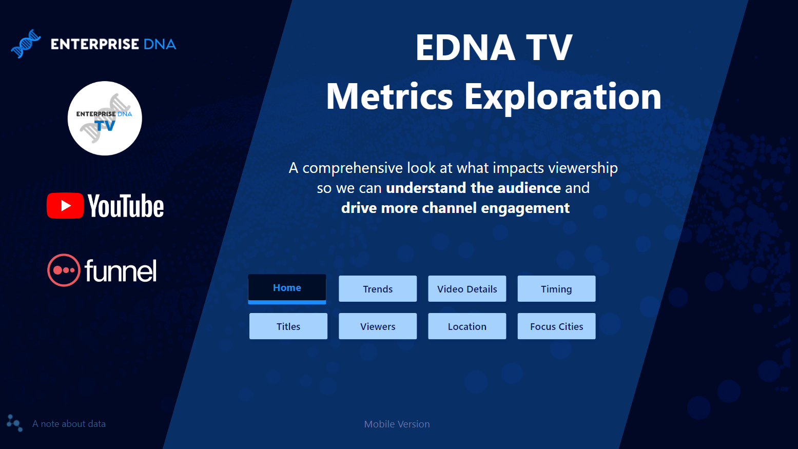 Video is a major component for many brands, so going beyond surface metrics to determine what resonates most with customers is critical. Are your titles catching people's eyes? Is your video length turning people off? This dashboard analyzes the YouTube channel of the internationally acclaimed Power BI training site, Enterprise DNA and uncovers actionable areas to optimize their content.